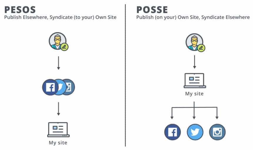 Il vient en opposition à la stratégie inverse qui consiste à publier un contenu sur un service tiers (LinkedIn, Instagram, TikTok, SoundCloud…) et à le partager sur son propre site web – grâce à l’affichage d’un flux par exemple.