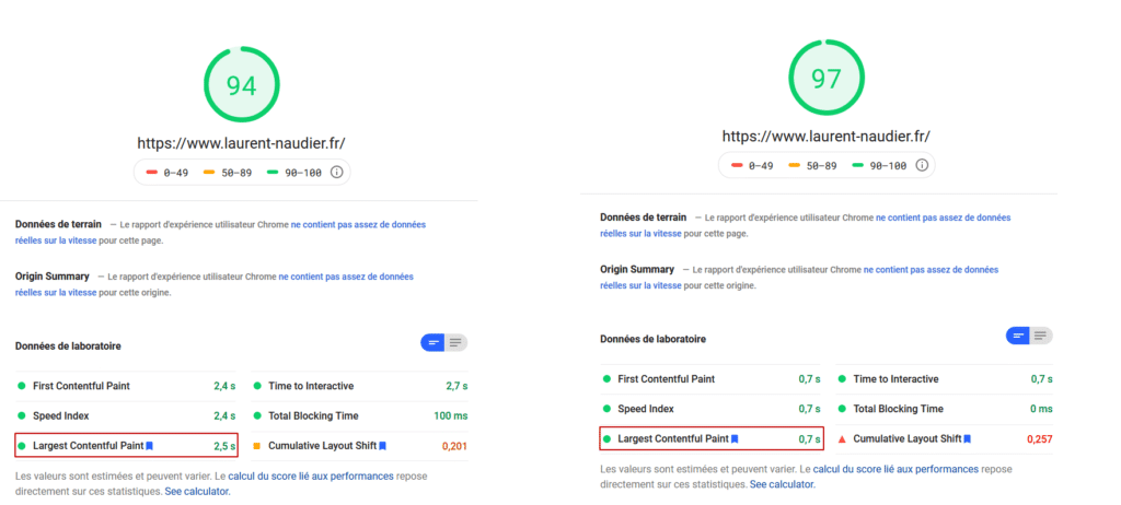Par exemple, au moment de la rédaction de cet article, l’indice LPC de ma page d’accueil est de 0,7 secondes (visuel de droite) sur ordinateur et de 2,5 secondes sur mobile (visuel de gauche) :