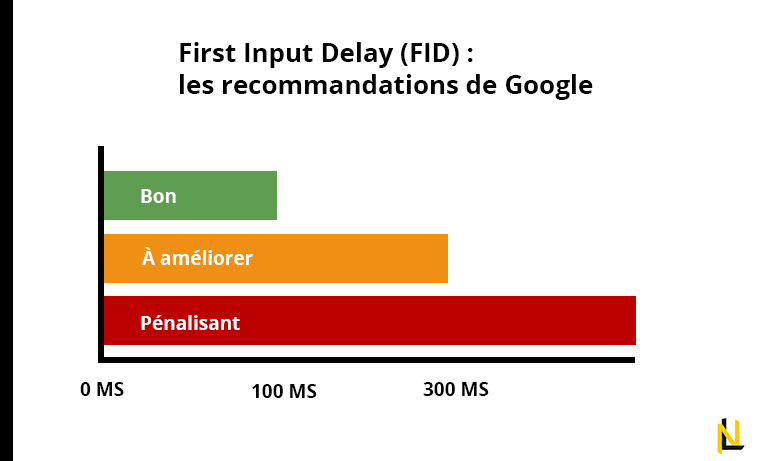 Si c’est le cas, Google recommande que le délai de latence soit inférieur à 100 ms (millisecondes). Entre 100 et 300 ms, votre site devra être amélioré et au-dessus de 300 ms, votre indice FID est très mauvais.