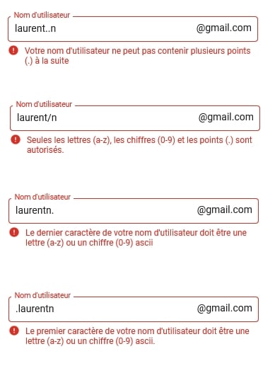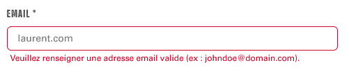Lorsque vous essayez de créer un compte avec une adresse qui n’est pas au bon format (vous oubliez le ‘@’ par exemple), le message suivant apparaît :