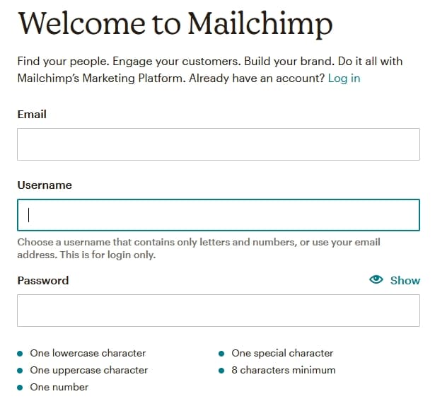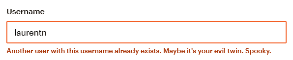 Par exemple : lorsque vous cherchez à vous connecter avec un identifiant qui existe déjà, non seulement le message vous indique que l’identifiant est déjà pris, mais Mailchimp ajoute une touche d’humour.